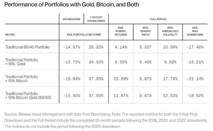 Bitwise bar saman hefðbundið 60/40 eignasafn við útgáfur þar sem bætt var við gulli, Bitcoin eða báðum eignum, með áherslu á markaðsáföllin árin 2018, 2020 og 2022.