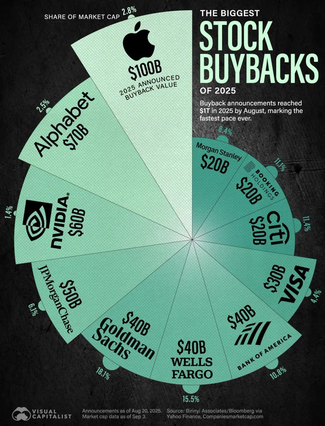Samhliða uppbyggingu innviða hafa sum þessara fyrirtækja dregið úr eigin hlutabréfakaupum. Slík kaup hafa lengi stutt við gengi hlutabréfa þeirra og mun koma í ljós hve mikil áhrif þessar breytingar hafa á markaðinn. Eins og sjá má á þessari mynd eru endurkaup stærstu fyrirtækja heims mjög umsvifamikil og hafa án efa áhrif á verðþróun þeirra á markaði.