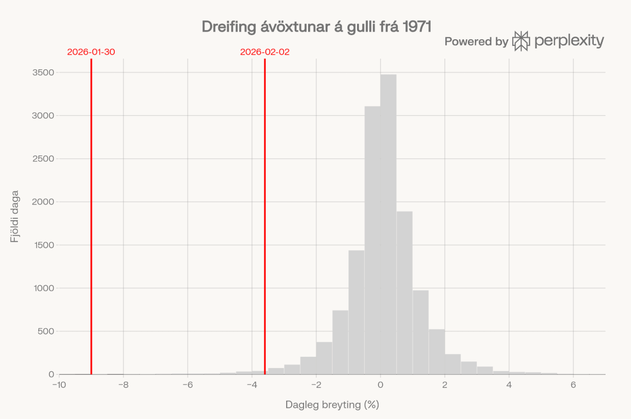 Í hugum margra eru sveiflur á verði Bitcoin meiri en flestra hlutabréfa en þegar betur er að gáð kemur annað í ljós. Það á ekki síður við á tímum sem þessum þar sem sveiflur í hlutabréfaverði hafa í mörgum tilfellum aukist. Óvissa um áhrif gervigreindar og órói í alþjóðamálum eru að valda miklum sveiflum á mörkuðum. Fjárfestar leita í skjól og þrátt fyrir hækkandi gullverð, þá hafa sveiflur í gullverði verið miklar. Sem dæmi um það lækkaði verð á gulli 9% á einum degi í lok janúar sem er mesta lækkun sem hefur sést í áratugi. Fyrsti viðskiptadagur í febrúar fór einnig í sögubækurnar þegar gull lækkaði 10% til viðbótar innan dagsins þótt dagslækkunin hafi verið tæp 5%. Hér sést sögulegt yfirlit á dreifni ávöxtunar á gulli sem sýnir hve miklar sveiflurnar eru orðnar.