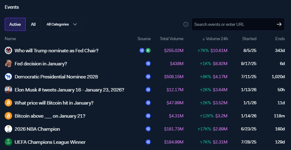 Áhugi stofnanafjárfesta lét ekki á sér standa. Í október 2025 fjárfesti Intercontinental Exchange, móðurfélag Kauphallarinnar í New York, allt að 2 milljörðum bandaríkjadala í Polymarket og mat þá virði vettvangsins á um 8 milljarða dala.